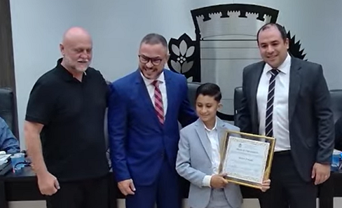 A Câmara de Campo Mourão também realizou sessão solene na manhã desta terça-feira. Foi para a entrega de moção ao piloto mirim Heittor Franzoli, de 9 anos. Ele é campeão paranaense de motocross categoria 50 cc (venceu oito das seis etapas). A moção foi entregue pelos vereadores Professor Geraldo e Marcio Berbet e pelo procurador Ramon Domingues, que representou o prefeito Douglas Fabrício.