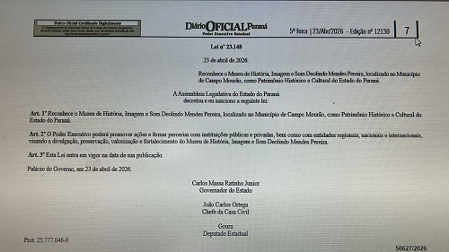 Agora é oficial. O Museu de História, Imagem e Som Deolindo Mendes Pereira, de Campo Mourão, é Patrimônio Histórico e Cultural do Paraná. A lei foi sancionada na última quinta-feira pelo governador Ratinho Jr. O projeto do deputado Goura tinha sido aprovado no dia 13 deste mês pela Assembleia Legislativa. Fundado em 1978, o museu reúne amplo acervo de fotografias, documentos e objetos históricos. O reconhecimento possibilita a formalização de parcerias para conservação e difusão do acervo.