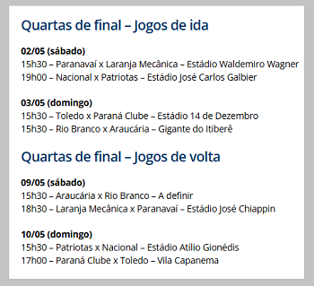 O adversário nas quartas será o Patriotas, que joga em Campo Largo.