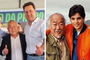 Não vá se confundir. À esquerda, o prefeito de Quarto Centenário, Akio Abe, e o governador Ratinho Jr, que se encontraram quinta-feira na inauguração do asfalto novo entre Quarto Centenário e Goioerê. À direita, seo Miyagi (Pat Morita) e Daniel San (Ralph Macchio) do filme “Karatê Kid – A Hora da Verdade”, de 1984.