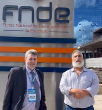 Same Saab, prefeito de Iretama e presidente da Comcam, em vídeo postado nas redes sociais em que aparece ao lado do prefeito de Nova Cantu, Airton Agnolin, em frente à sede do FNDE, em Brasília; nesta quinta-feira.