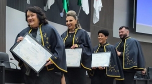 O plenário da Câmara de Campo Mourão ficou lotado neste sábado à noite. Foi para a sessão solene da Academia Mourãoense de Letras que deu posse a sete pessoas. Foram três novas membras titulares, dois membros honorários e os dois primeiros membros beneméritos. A AML é presidida pelo professor Fábio Sexugi, de Peabiru. Entre os presentes, o vereador Tião do Karatê e o ex-prefeito Tauillo Tezelli.