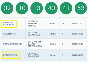 Ninguém acertou as seis dezenas da Mega Sena, que foram sorteados nesta quinta-feira. Assim, o prêmio que estava em R$ 11 milhões deve chegar a R$ 31 milhões no próximo sorteio, sábado. A quina teve 41 apostas ganhadoras e cada uma fica com R$ 49,6 mil. Quatro são do Paraná, sendo duas da região – Barbosa Ferraz (lotérica Barbosa Ferraz) e Roncador (lotérica Roncador).