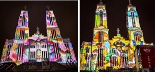 O que é que achou? Não é a Catedral São José, de Campo Mourão, não. As fotos são da paróquia Puríssimo Coração de Maria, de São Bento do Sul/SC, que tem o mesmo projeto arquitetônico. Ela ficou toda colorida assim no último sábado, em projeções feitas pela Vita.art.br, durante apresentação da Orquestra Brasileira.
