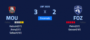 Campo Mourão venceu o Foz Cataratas por 3 a 2, nesta segunda-feira fria, no Ginasião, pela Liga Nacional de Futsal.