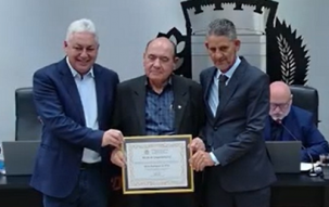 A Câmara de Campo Mourão realizou sessão solene na última sexta-feira à noite. Foi para entrega de moção ao delegado-chefe da 16ª SDP, Nilson Rodrigues da Silva, pelo trabalho da Polícia Civil durante a 30ª Festa Nacional do Carneiro no Buraco. A entrega foi feita pelo vereador autor da homenagem, Jadir Pepita, e pelo prefeito Douglas Fabrício. Sete vereadores participaram da sessão.