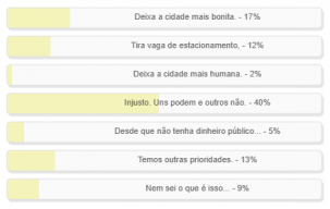 ”Qual a sua opinião sobre a instalação de parklets nas ruas da cidade?” Enquete com esta pergunta teve votação encerrada neste domingo. Venceu a alternativa “Injusto. Uns podem e outros não”, com 40% dos votos. “Deixa a cidade mais bonita” ficou em segundo, com 17%. “Temos outras prioridades” fechou o pódio, com 13%. O resultado completo está no quadro acima.
