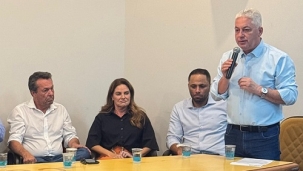 Douglas Fabrício, prefeito de Campo Mourão, falando, com bom humor, do secretário de Estado Márcio Nunes (Turismo); durante discurso na assembleia da Comcam, quinta-feira.