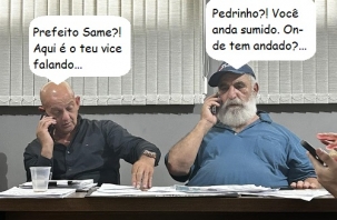 O clic é desta segunda-feira, em Iretama, no momento em que o prefeito Same Saab e o vice-prefeito Pedrinho Bodnar falam, lado a lado, ao celular. “Segunda de muito trabalho”, diz a legenda da foto postada em redes sociais.