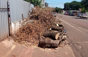 Calçada na rua São Josafat obstruída por troncos e galhos de árvores.