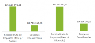 O município investiu, durante o ano passado, 24,69% da receita na saúde. Foram R$ 84,7 milhões. O mínimo previsto em lei é 15%. Na educação, o investimento foi de R$ 106,3 milhões (30,2%). O mínimo exigido é 25%.