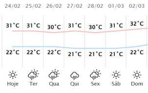 Os termômetros vão chegar à casa dos 30 graus todos os dias desta semana em Campo Mourão. A previsão é do Simepar. Começa com máxima de 31 graus nesta segunda-feira e chega aos 32 no domingo. Haverá pancadas de chuva na terça, quarta e sexta. Para quinta a previsão é de 15,8 mm de chuvas e, mesmo assim, a temperatura vaia a 31 graus. Para a semana seguinte a previsão é de calor ainda mais intenso.