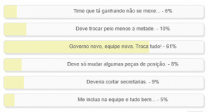 “Como o prefeito eleito de Campo Mourão deve montar sua equipe de secretários?” Enquete encerrada neste domingo deu vitória, com folga, à alternativa “Governo novo, equipe nova. Troca tudo!”, com 61% dos votos. Em segundo lugar ficou “Deve trocar pelo menos a metade”, com 10%, e, em terceiro, “Deveria cortar secretarias”, com 9%. O resultado completo está no quadro acima.