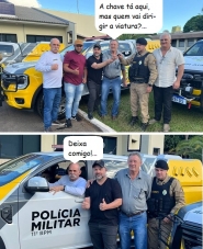 O clic é de Maringá, onde o prefeito de Luiziana, Wilson Tureck, participou da entrega de uma viatura para o destacamento luizianense da Polícia Militar. O veículo foi entregue pelo deputado federal Sargento Fahur ao comandante do destacamento, sargento Mendes. O parlamentar também fez pose dentro da viatura.