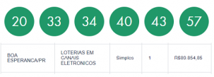 A Mega Sena sorteou nesta terça-feira prêmio acumulado em R$ 10 milhões. Resultado? Ninguém acertou as seis dezenas, não. Assim, o prêmio deve chegar a R$ 14 milhões no concurso que vai a sorteio na quinta-feira. Já a quina teve 21 apostas ganhadores e cada uma vai levar R$ 89,6 mil. Três são do Paraná, sendo uma de Boa Esperança, feita através de canais eletrônicos.