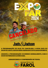 Na Expofar, o show com a dupla Jads & Jadson será remarcado para outra data.