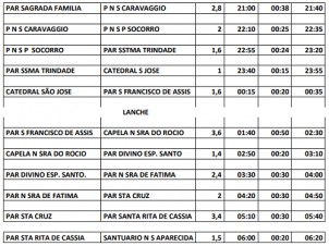 Quer participar do evento Caminhando com Maria, em Campo Mourão, que este ano será noturno? A organização preparou um quadro que mostra o horário que a caminhada passará em cada uma das 12 paróquias. Tem a distância entre elas, o horário e o tempo previsto para chegar à paróquia seguinte.