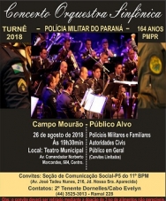 A Orquestra Sinfônica da Polícia Militar do Paraná vai se apresentar neste domingo (19h30) no Teatro Municipal de Campo Mourão. A apresentação faz parte as comemorações pelos 164 anos da PM. O evento é abertura à comunidade, mas é preciso retirar convite no batalhão. Será cobrado a doação de 3 kg de alimentos. Mais informações: (44) 3525-3013 ramal 228