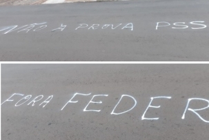 Terça-feira foi dia de protesto da APP-Sindicato em frente à Secretairia de Estado da Educação, em Curitiba, e em frente aos núcleos regionais. Em Campo Mourão, frases foram escritas no asfalto. Não faltou o "Fora Feder", em referência ao secretário Renato Feder. A prinicpal reivindicação é o cancelamento do edital para contratação via PSS. O governo do Estado recebeu à tarde representantes da APP.