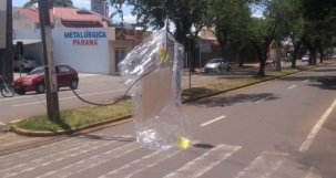 A fiozeira continua pelos postes e ruas de Campo Mourão. Na av. Goioerê, nesta quarta-feira, alguém se preocupou e "sinalizou" o fio que ficou pendurado sobre a via.