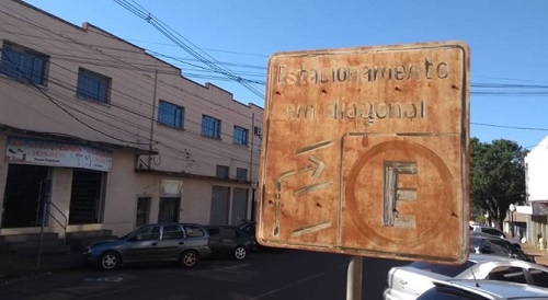 Olha o estado dessa placa na rua Brasil, esquina com av. Irmãos Pereira.