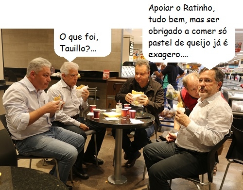 Fazer política também dá fome. O quarteto acima que o diga. Os deputados Rubens Bueno e Douglas Fabricio, o prefeito Tauillo Tezelli e o ex-prefeito Fábio D"Alécio (Ubiratã) deram uma pausa para comer um pastel. Os quatro são do PPS, partido que está com Ratinho Jr (PSD) para governador.