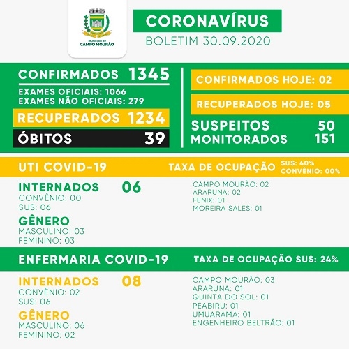 Regional - Sete municípios da região confirmaram mais 13 casos de covid nesta quarta-feira. O total foi a 3.882. Anote lá: Campo Mourão 2, Goioerê 1, Mamborê 1, Peabiru 2, Rancho Alegre do Oeste 1, Terra Boa 5 e Ubiratã 1.