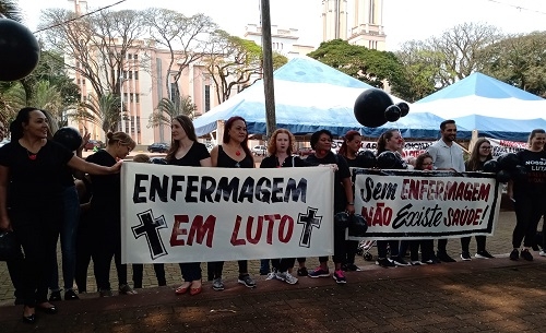 Profissionais de enfermagem, com apoio de sindicatos de trabalhadores, fizeram protesto nesta sexta-feira no centro de Campo Mourão. Foi contra a liminar do STF que suspendeu os efeitos do novo piso da categoria. A lei prevê R$ 4.750 para enfermeiros, 70% desse valor para técnicos de enfermagem e 50% para auxiliares de enfermagem e parteiras. Os profissionais usaram roupas pretas, levaram faixas e cartazes e discursaram pedindo a aplicação da lei.