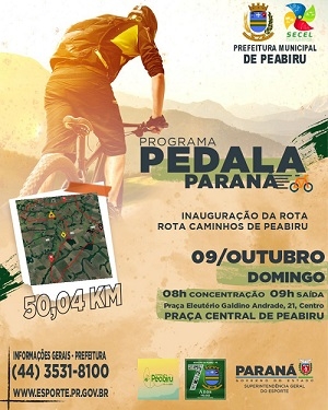 Que tal percorrer trecho do Caminho de Peabiru de bicicleta? Então anote aí na agenda que no dia 9 de outubro será inaugurada a Rota Caminhos de Peabiru do programa Pedala Paraná. O percurso terá 50 km com saída da praça central de Peabiru, às 9h. O Pedala Paraná visa instalar e equipar ciclorrotas em todo o Estado. A inscrição é gratuita.