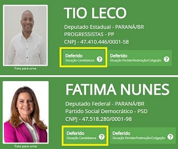 A Justiça Eleitoral deferiu os registros dos dois primeiros candidatos a deputado de Campo Mourão e região. São eles o vereador Tio Leco (PP) para deputado estadual e a vice-prefeita Fátima Nunes (PSD) para deputada federal. Isso pode ser visto no site "Divulgacand", do TSE. Os demais candidatos ainda aparecem como "aguardando julgamento", ou seja, o TRE não analisou ainda a papelada.