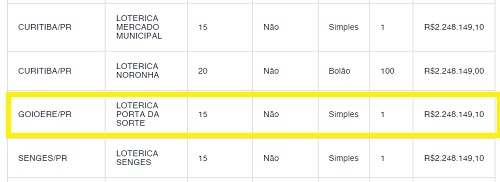 Uma aposta de Goioerê foi uma das 79 que cravaram os 15 números de Loto Fácil da Independência, sorteada neste sábado. O prêmio total era de quase R$ 180 milhões e cada um vai levar pra casa R$ 2,2 milhões. No Paraná houve apenas mais três ganhadores - dois em Curitiba e um em Sengés. No caso de Goioerê, foi uma aposta simples feita na lotérica Porta da Sorte.