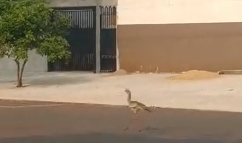 Na manhã deste domingo, siriema passeia tranquilamente por rua do jardim Paulista, em Campo Mourão.