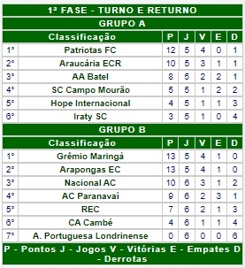 O Sport Campo Mourão empatou em 0 a 0 com o Batel, neste domingo, em Guarapuava, pela Terceirona do Paranaense. Foi o terceiro jogo seguido sem derrota e sem tomar gols. Assim, o time fechou o primeiro turno com cinco pontos e na quarta posição no grupo A. Os dois primeiros vão para as semifinais. O returno começa no próximo domingo com o Sport jogando em Curitiba contra o líder Patriotas (12 pontos). O jogo será na Vila Capanema, o estádio do Paraná Clube.