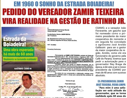 Olha o jornal que estava circulando nesta sexta-feira na Boca Maldita, em Curitiba. A edição do "Impacto Paraná" trazia matéria sobre a conclusão de mais um trecho de asfalto da Estrada Boiadeira. Agora, repare no título: "Pedido do vereador Zamir Teixeira vira realidade na gestão de Ratinho Jr".