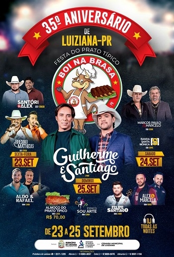 Começa nesta sexta-feira a programação para comemorar os 35 anos de emancipação de Luiziana. Acontecem shows musicais na sexta, no sábado e no domingo. O último dia, que é a data do aniversário, tem a dupla Guilherme & Santiago, além de apresentação do Sou Arte. Sem contar que o almoço é o Boi na Brasa. O convite para o prato típico custa R$ 70.