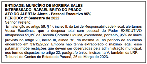 De acordo com despacho publicado nesta quarta-feira, a prefeitura encerrou o segundo semestre de 2022 comprometendo acima de 51,3%da receita corrente líquida com a folha de pagamento. Ou seja: chegou perto do limite de 54%. "Embora não tenha extrapolado o máximo legal, esse patamar impõe restrições que devem ser observadas pela administração municipal", destaca a publicação.