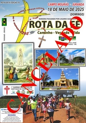 Foi cancelada a 70ª edição da Rota da Fé que seria realizada no próximo fim de semana, entre Campo Mourão e Juranda. A decisão foi anunciada nesta terça-feira. Uma nota data para a peregrinação deve ser definida nos próximos dias (provavelmente em junho).