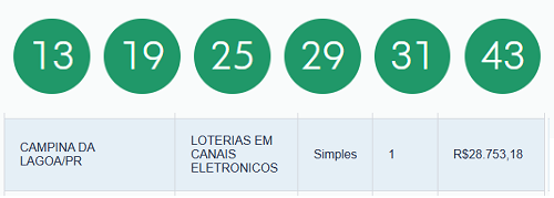 Uma aposta de Cruzeiro/SP acertou sozinha as seis dezenas da Mega Sena sorteadas neste sábado. Levou prêmio de R$ 59,7 milhões. A quina teve 164 apostas ganhadoras e cada uma faturou R$ 28,7 mil. Dezesseis foram feitas no Paraná, sendo uma delas em Campina da Lagoa, através de loterias em canais eletrônicos.