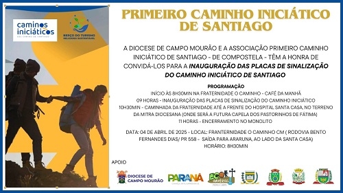 Marcada a inauguração das placas de sinalização do 1º Caminho Iniciático de Santiago de Compostela. Será na próxima sexta-feira (8h30), na Fraternidade O Caminho, onde fica o “ponto zero” da peregrinação, em Campo Mourão. Em seguida haverá caminhada até em frente à Santa Casa, no terreno da Mitra Diocesana onde será construída a Capela dos Pastorzinhos de Fátima. O 1º Caminho Iniciático também passa por Corumbataí do Sul, Barbosa Ferraz e Fênix.