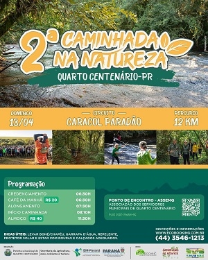 Tá chegando a hora a primeira Caminhada Internacional na Natureza, deste ano, na região da Comcam. Será no próximo dia 13 em Quarto Centenário. Será a segunda edição do Circuito Caracol Paradão, com 12 km entre trilhas e estradas rurais. As inscrições já estão abertas e até esta segunda-feira havia 107 pessoas inscritas.