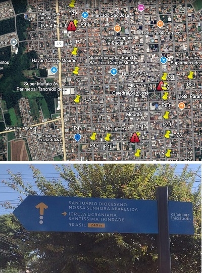“Essa placa é a P41 no mapa (acima), ela está indicando a próxima placa a 249m, com chegada da Igreja Ucraniana, que no mapa está representando pela P47. Não tem nada de errado com essa placa”.