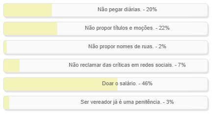 “Que penitência os vereadores deveriam fazer na quaresma?” Enquete encerrada neste domingo deu vitória, com folga, à alternativa “Doar o salário”, com 46% dos votos. “Não propor títulos e moções” ficou em segundo, com 22%. “Não pegar diárias” fechou em terceiro, com 20%. O resultado completo está no quadro acima.