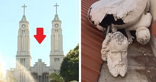 Muita gente nem percebeu, mas a imagem de São José que ficava no meio das torres da Catedral de Campo Mourão, “sumiu”. A estátua de fibra de vidro, com 5 metros de altura, caiu durante um temporal no início deste mês. Caiu para trás e ficou em cima do telhado, onde está até hoje. A cabeça do santo quebrou. A imagem tinha sido instalada em março de 2015. A TV Carajás fez reportagem sobre a queda do santo.