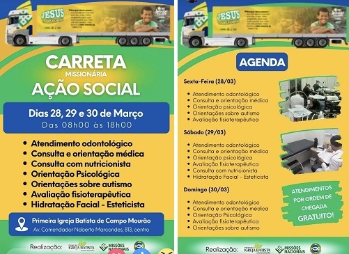 A Carreta Missionária estará nesta sexta, sábado e domingo na 1ª Igreja Batista de Campo Mourão (av. Comendador Norberto Marcondes, 813). Com ela vem uma série de atendimentos gratuitos, por ordem de chegada. Tem atendimento odontológico, consulta e orientação médica, consulta com nutricionista e orientação psicológica, entre outros (veja programação acima).