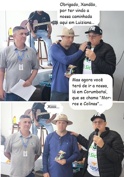 Os cliques são do último domingo, em Luiziana, que realizou a 8ª Caminhada Internacional na Natureza. O evento reuniu mais de 500 pessoas, de 28 municípios. Na hora do cerimonial, o prefeito anfitrião Edson Liss recebeu o prefeito de Corumbataí do Sul, Xandão Donato. A caminhada de Luiziana inovou ao oferecer café da manhã e almoço de graça aos participantes.