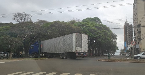 Carreta no centro de Campo Mourão, nesta segunda-feira à tarde, com direito a passar pela contramão para entrar na av. Irmãos Pereira.