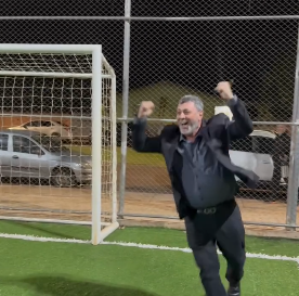 Olha a alegria do prefeito de Nova Cantu, Airton Agnolin. Foi sexta-feira, na inauguração do Meu Campinho no distrito de Santo Rei. A comemoração toda aconteceu na hora que ele estava de goleiro e defendeu um chute do deputado estadual Artagão Jr. A obra recebeu investimentos de R$ 455 mil. No mesmo dia foi inaugurada no distrito a capela mortuária (R$ 552 mil).