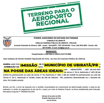 O Juízo da Comarca assinou a imissão de posse da área prevista para construção do aeroporto de Ubiratã.