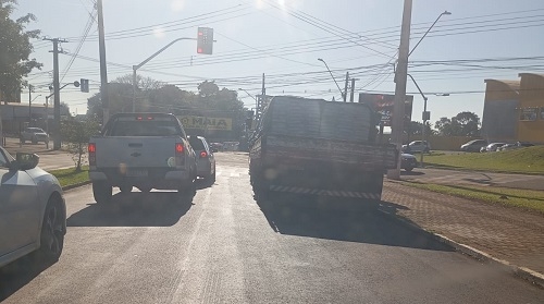 “Caminhão estacionado no semáforo pra descarregar. Na minha opinião atrapalha no semáforo e nem faixa de estacionar existe no local”.