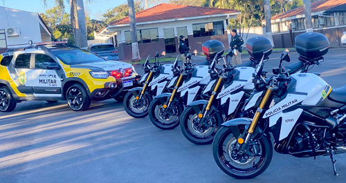 Teve solenidade nesta terça-feira no 11º BPM, de Campo Mourão, para entrega de novas viaturas – uma Chevrolet Trailblazer para a Rotam; uma Renault Duster, para o patrulhamento preventivo e quatro motocicletas Suzuki GSX-S1000, para o policiamento de trânsito. O prefeito Douglas Fabrício prestigiou o evento.